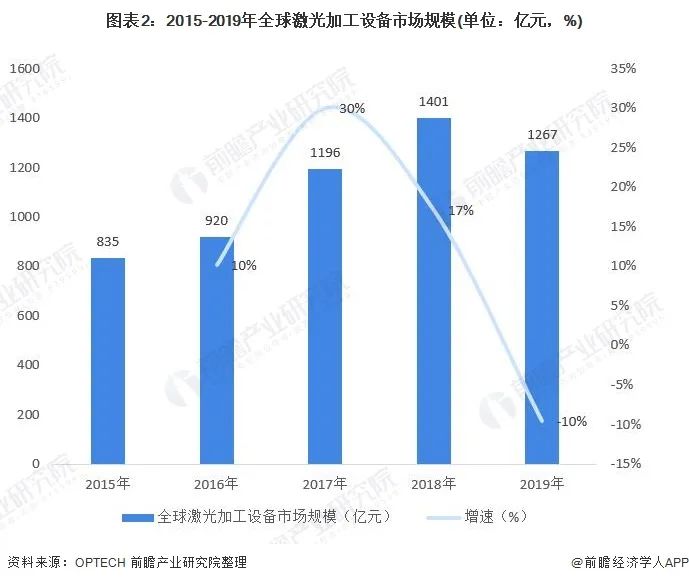 全球激光加工設(shè)備市場(chǎng)規(guī)模超過(guò)千億元,2019年達(dá)到1267億元,同比下降10%。