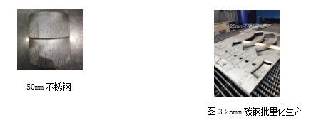 近幾年,激光切割的市場需求不斷加大,人們對于其加工能力的期待也越來越高,這種期待不僅僅是對能夠切,還必須保證切得好和切得快。針對25mm以上厚度的碳鋼板,為了獲得良好的切割效果,大族激光智能裝備集團以厚板穿孔、切割面質量及整板加工等關鍵技術難點作為主攻方向,隨著萬瓦級功率切割技術不斷成熟且越多的被用于實際金屬板材加工中,積累了豐富的應用經(jīng)驗,并逐漸掌握了厚板高品質切割工藝。當前25mm以上厚度碳鋼已實現(xiàn)批量穩(wěn)定生產(chǎn),25mm碳鋼切割速度達1.2m/min。